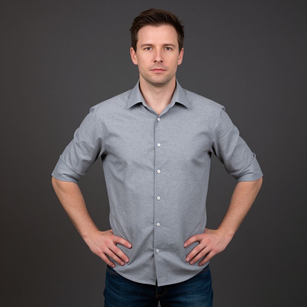 A man with a bald head is standing with his hands on his hips. He is wearing a black and orange jacket with a black belt.