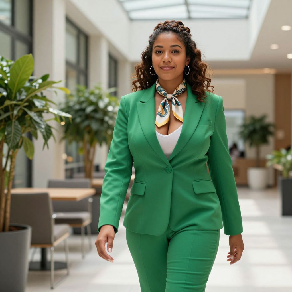 A vibrant woman with a warm amber complexion and curly brown hair in a half-up style wearing a bright green office pant suit with a patterned scarf and modern minimalist accessories, walking through a stylish urban office lobby with plants and soft lighting, natural sunlight filtering through the ceiling. The woman has big tits and cute face