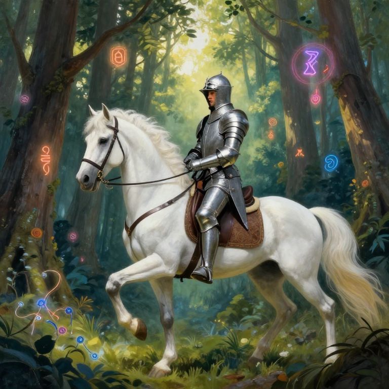 Digital painting of a knight in shiny silver armor riding a white horse through a magical forest with glowing runes and symbols.