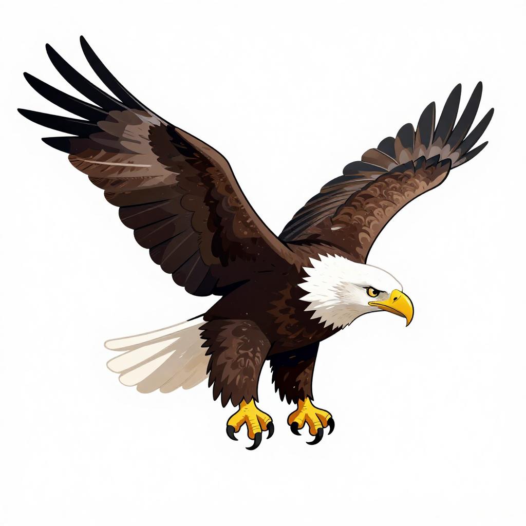 Black and white illustration of a powerful eagle with spread wings soaring above jagged rocky mountains and clouds. The eagle features a yellow beak and talons, depicted with bold lines and dynamic motion. The background includes a circular design element and stylized cloud formations.