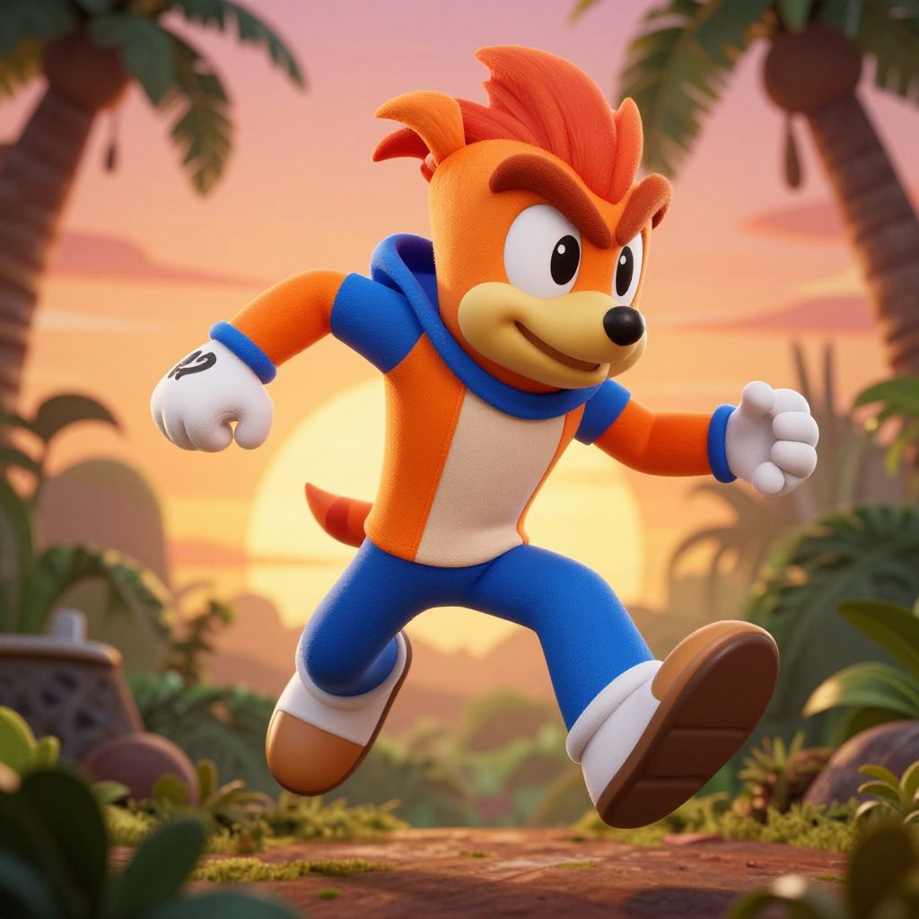 Vivid Crash Bandicoot costume with bold orange and blue hues, set against a sunset jungle backdrop, dynamic action pose like jumping or spinning, blending cartoon and semi-realistic art styles, perfect for cosplay photography or game character rendering.