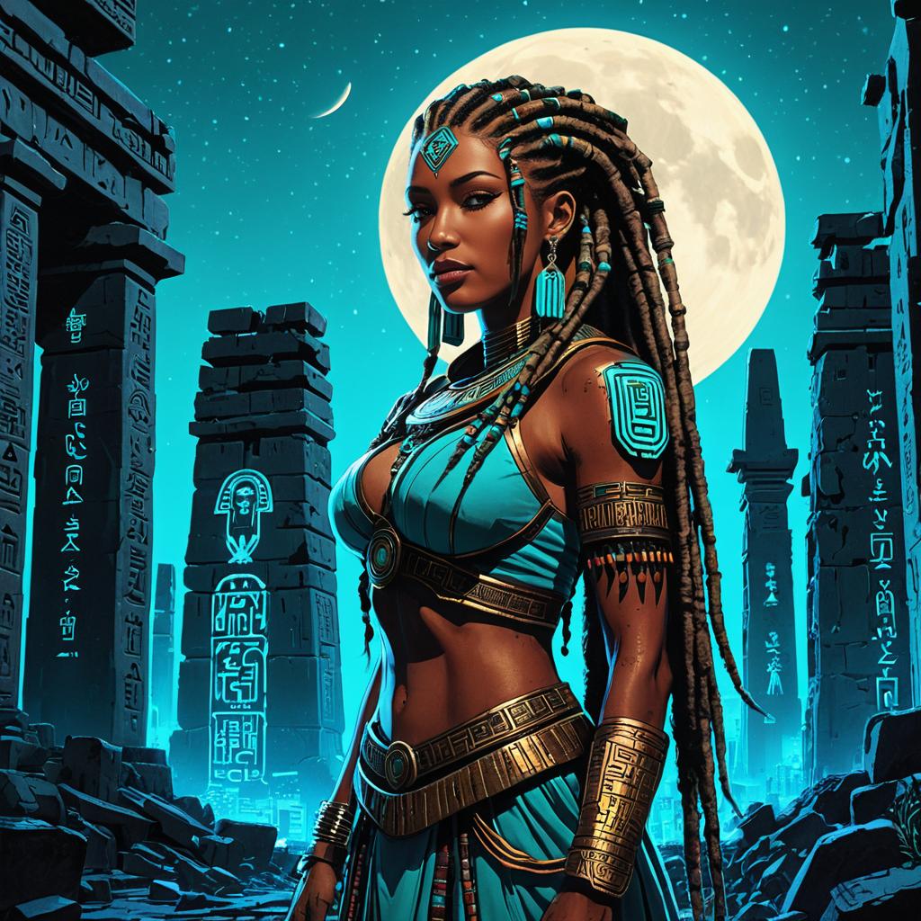 Hyper-detailed portrait of a cyber-samurai warrior queen with tan bronze skin and Egyptian-Sumerian facial features. She has aqua neon Rapunzel-style dreadlocks adorned with metallic accents and glowing blue hieroglyphic face paint. The woman is dressed in futuristic armor with intricate patterns and glowing turquoise elements. The background features a vibrant neon-soaked cyberpunk cityscape with illuminated high-rise buildings and neon signs. The image combines ancient aesthetics with a futuristic cyberpunk setting.