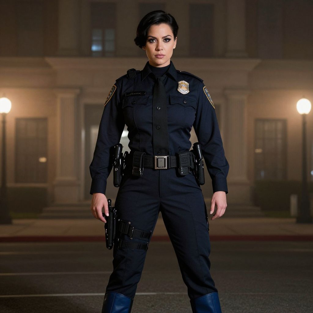 A dramatic photograph of a police woman in a nighttime patrol outfit — a dark navy police uniform with a high collar, duty belt, and blue boots — standing in front of a city building with foggy ambient lighting; she has a strong, defined face with a determined look, dark eyes, and a neatly styled short haircut.. The woman has big tits and cute face