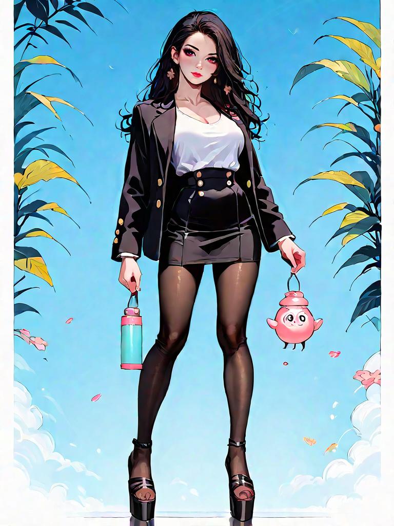 Full-body illustration of a fashionable woman standing outdoors against a clear blue sky. She wears a sleek black fitted blazer and a hot pink mini skirt with a flared hem, paired with a white tank top and opaque black tights. Her long hair is styled down, and she sports black platform heels with open toes. She holds a turquoise thermos in one hand and a cartoonish pink teapot-shaped accessory in the other. The scene is framed by lush greenery with yellow and green leaves on both sides.