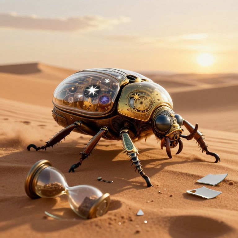 This is a digital artwork of a hyper-realistic, sci-fi beetle with a metallic, glassy exoskeleton adorned with star-like patterns and intricate golden gears on its back. The beetle, with black, spiky legs and a shiny, reflective head, is positioned on a sandy, desert-like surface. The background features a bright, sunlit sky with soft orange and yellow hues. In the foreground, a broken, glass hourglass and a small, silver piece of metal are scattered on the sand, adding to the surreal, futuristic feel. The image combines realistic textures with fantastical elements, creating a striking, otherworldly scene.