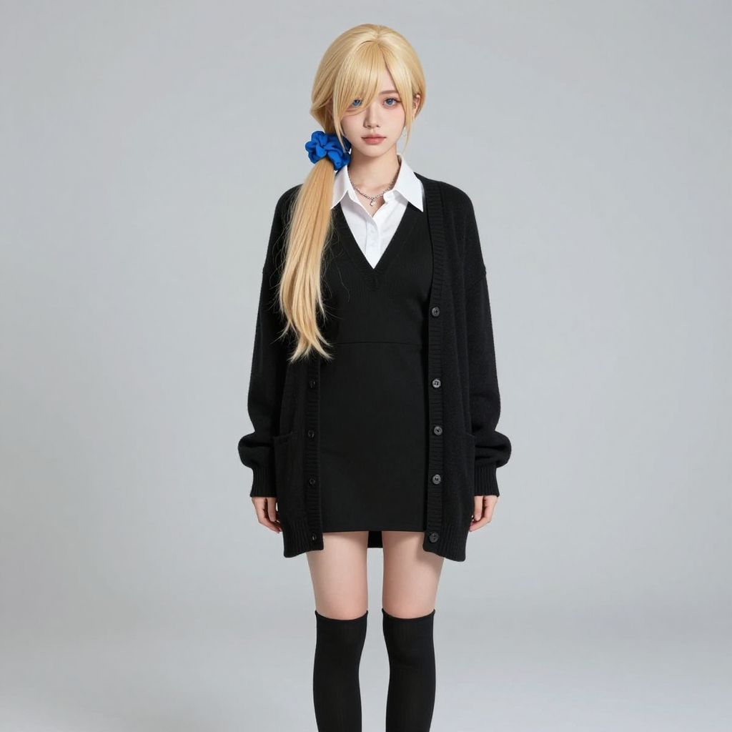 Masterpeace, best quality, highres, 1girl, solo, hayasaka ai, blue scrunchie, side ponytail, hair between eyes, blue eyes, blonde hair, hair ornament, breasts, school uniform, collared shirt, hair scrunchie, clothes around waist, bangs, black socks, black vest, long hair, long sleeves, cardigan, sidelocks, kneehighs, dress shirt, necklace, collarbone, black dress, jewelry, sweater, cowboy shot, standing