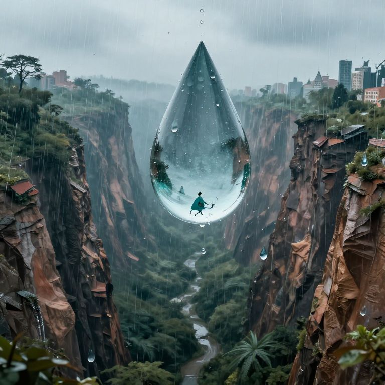 Digital artwork: A giant water droplet containing a small silhouette walking between towering, lush canyon cliffs with rain, buildings, and a winding path.
