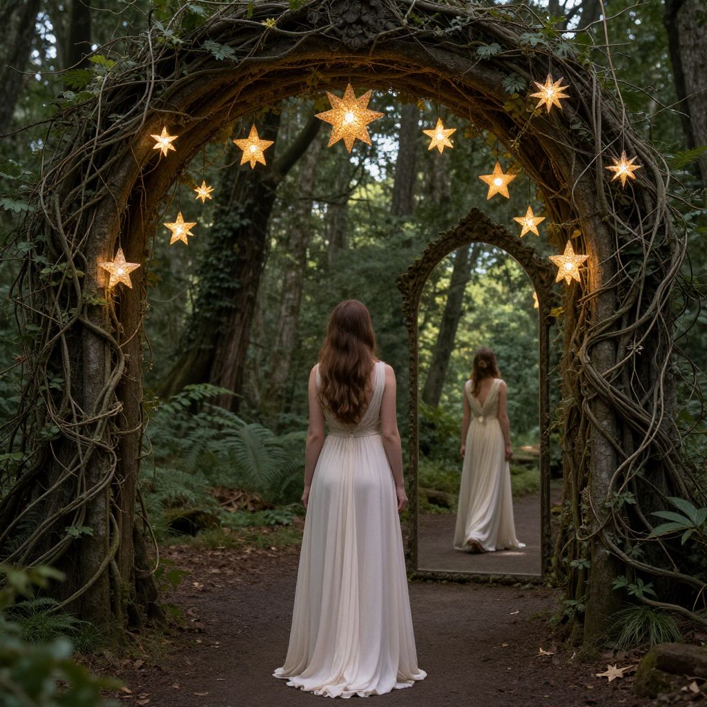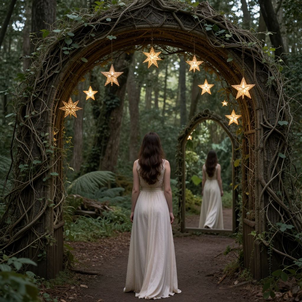 Photograph of a woman with long brown hair in a white, flowing dress, standing before a forest archway mirror adorned with glowing stars, reflecting her