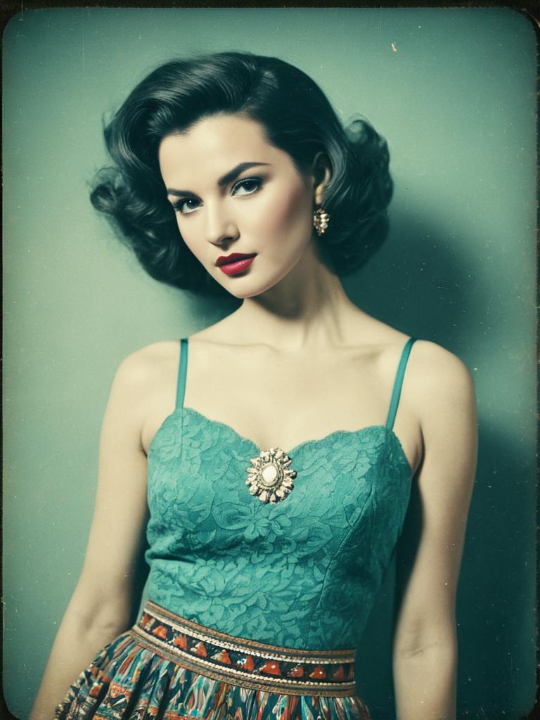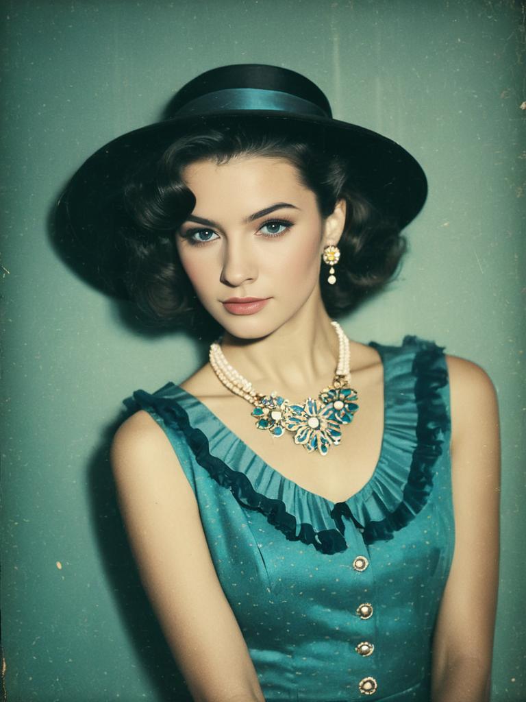 Portrait of a young woman with vintage hairstyle wearing a teal textured skater dress with thin spaghetti straps and a sweetheart neckline. She accessorizes with layered pearl-like necklaces and bracelets. The background is a muted green tone with a subtle vignette effect, enhancing the retro aesthetic.
