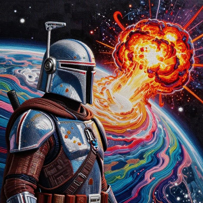 Embroidery Stitch Dictionary The mandalorion from star wars , watching a planet explode from space, with cosmic colourful waves in the background, volumetric lighting, cinematic, hyperrealistic,