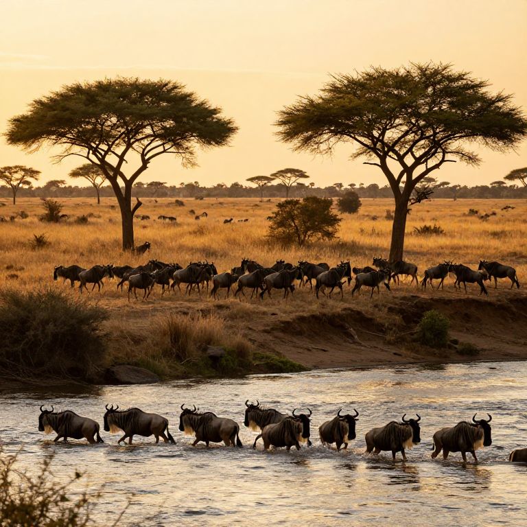 A striking natural habitat with a herd of wildebeests crossing a river, surrounded by acacia trees and a vast open plain under a golden sunset.