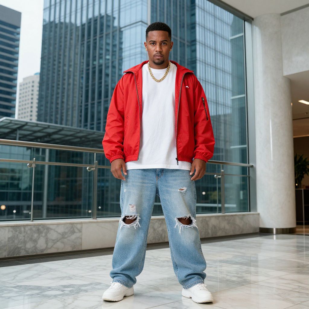 A man, bright red windbreaker, oversized white graphic tee, distressed light blue baggy jeans, chunky white sneakers, layered gold chains, modern glass skyscraper, sleek lobby with marble floors, cinecolor, confident expression Man has masculine face and piercing eyes