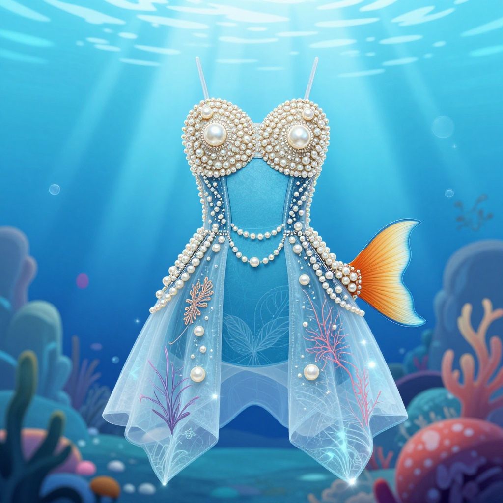 Digital artwork of a mermaid dress adorned with pearls and sequins, with a vibrant orange fish tail, floating underwater amidst colorful coral and ocean plants.