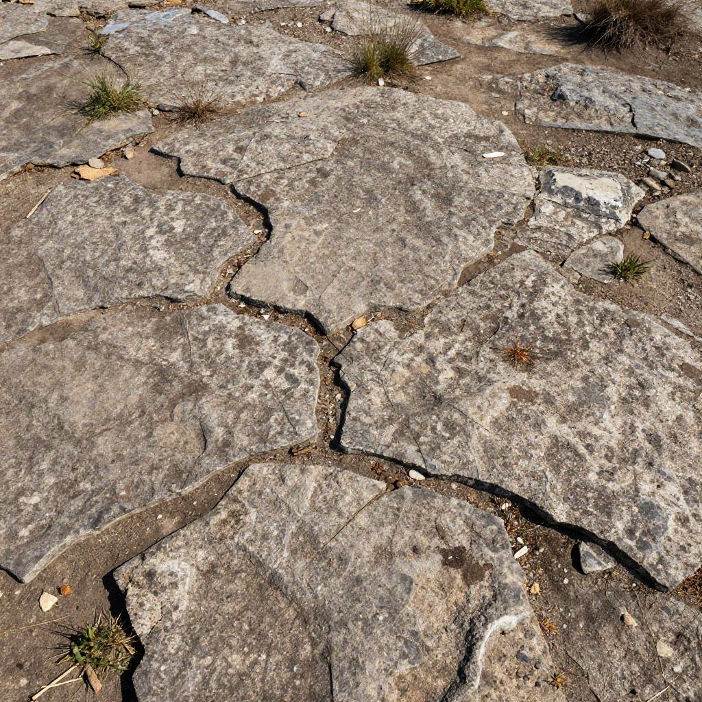 Stone ground texture, rugged outdoor terrain made of cracked stones with patches of dirt and sparse grass, under natural sunlight casting detailed shadows that emphasize the rough texture and natural wear of the stone pavement in a wild landscape.