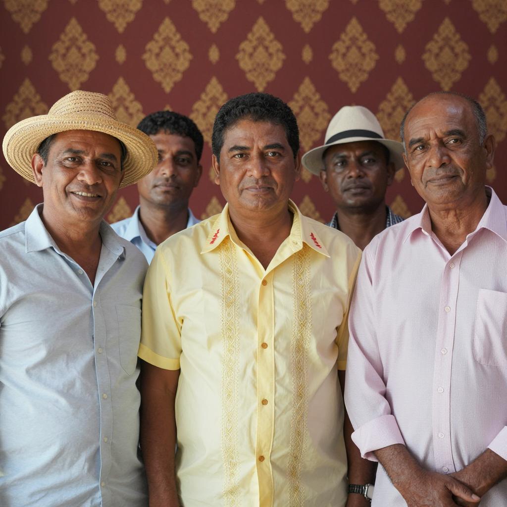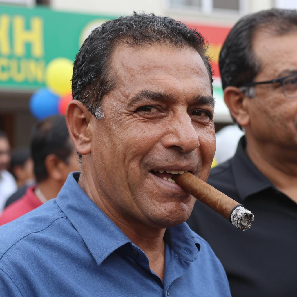 Close-up photograph of a smiling man with dark hair, a cigar in his mouth, and a blue shirt. Another man with glasses and a black shirt stands to the right, slightly blurred. Background includes a green sign with yellow , balloons, and indistinct people.
