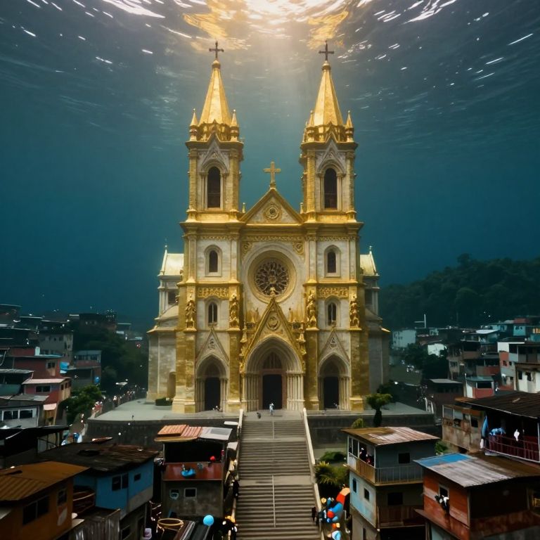 Cathedral favela, underwater environment, scenery, professional, award - winning, trending on artstation, hyper detailed, realistic, beautiful, emotional, shiny, golden, picture