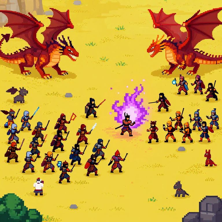 Images to pixel art illustrating an epic fantasy battle on a vast battlefield, with pixelated warriors, dragons, and magic effects, balancing pixel simplicity with dynamic action and rich storytelling elements.