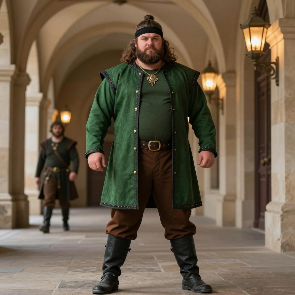 Full body portrait of a plus size bald man standing indoors wearing a Lord of the Rings inspired costume. The outfit includes a green velvet robe with gold embroidered cuffs, a dark gray textured cloak, a wide leather belt with a large buckle, brown boots, and jewelry including two necklaces with pendants. The setting is a warmly lit room with wooden flooring and traditional decor.