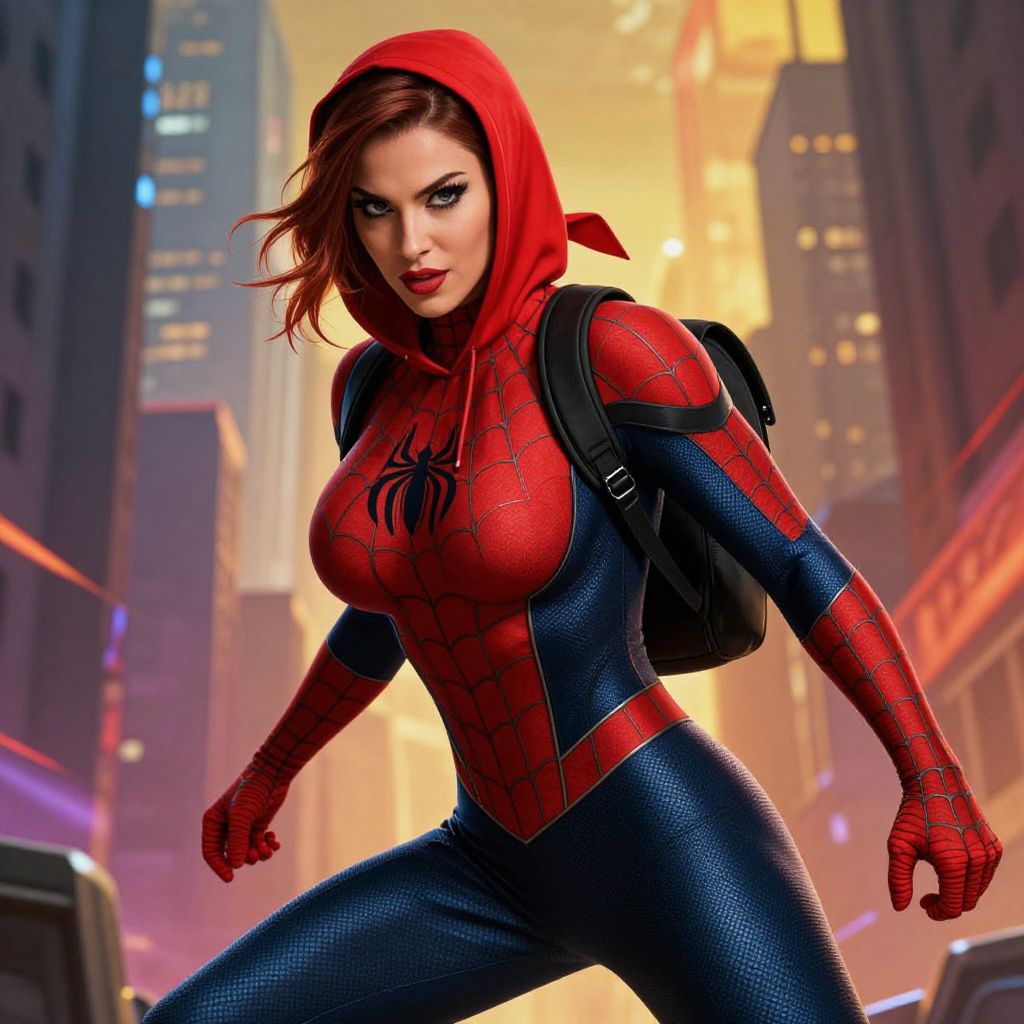 Photorealistic digital art of a red-haired woman in a Spider-Woman suit with a hood, backpack, and city skyline background.