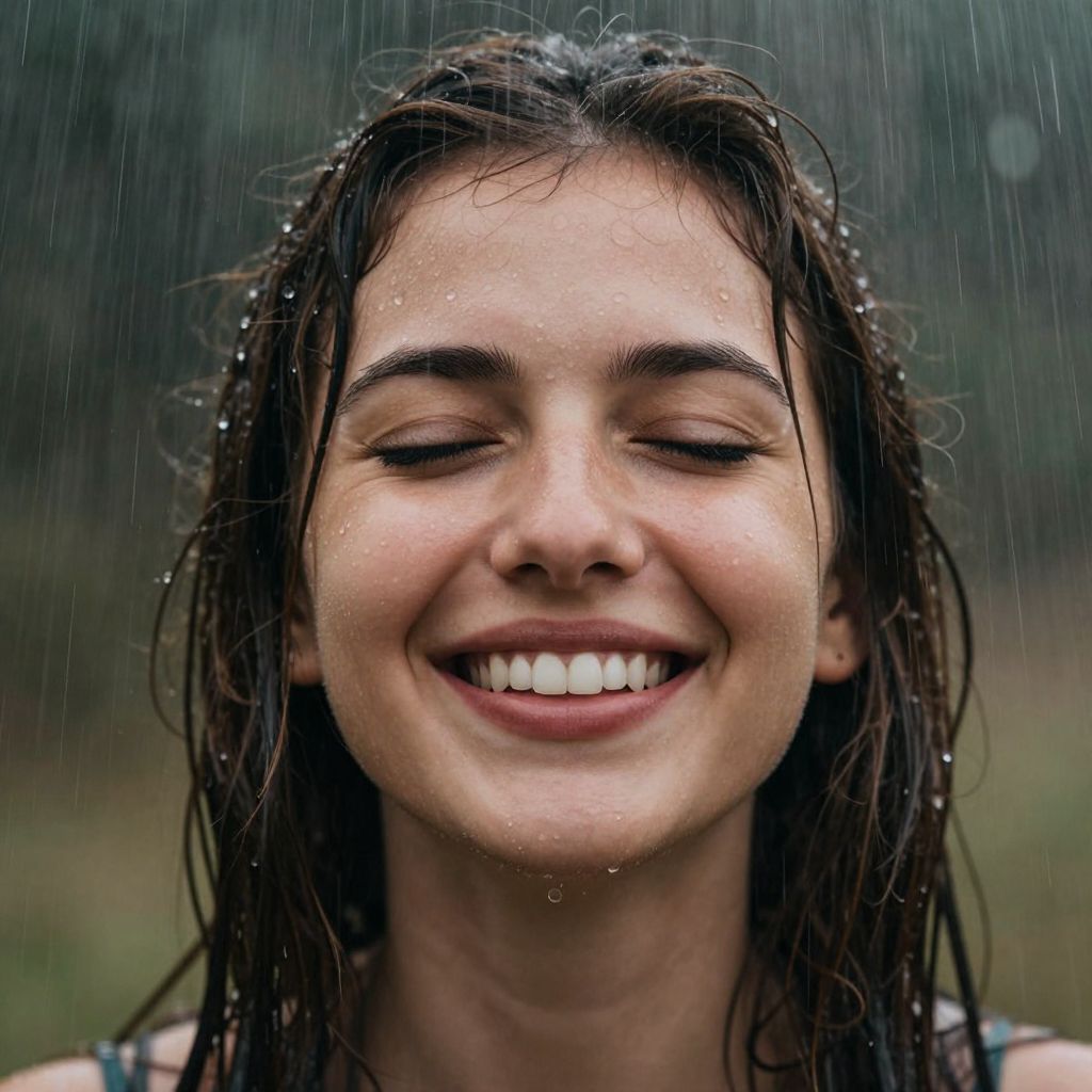 In this captivating image, a woman's face is the focal point, bathed in the gentle embrace of raindrops that cascade down her features, creating a dynamic interplay of light and shadow. Her eyes are closed, lost in a moment of pure, unadulterated joy, as her lips curve into a wide, radiant smile. The raindrops, small and numerous, dot her face, highlighting the texture of her skin and the softness of her expression. Her hair, a rich, dark brown, is tousled and wet, adding to the sense of movement and spontaneity. The background is a soft blur, keeping the viewer's attention firmly on the woman's face and the rain that envelops her, creating a sense of depth and atmosphere. The overall composition is balanced, with the woman's face centrally positioned, drawing the eye immediately to her joyful expression and the rain that surrounds her.