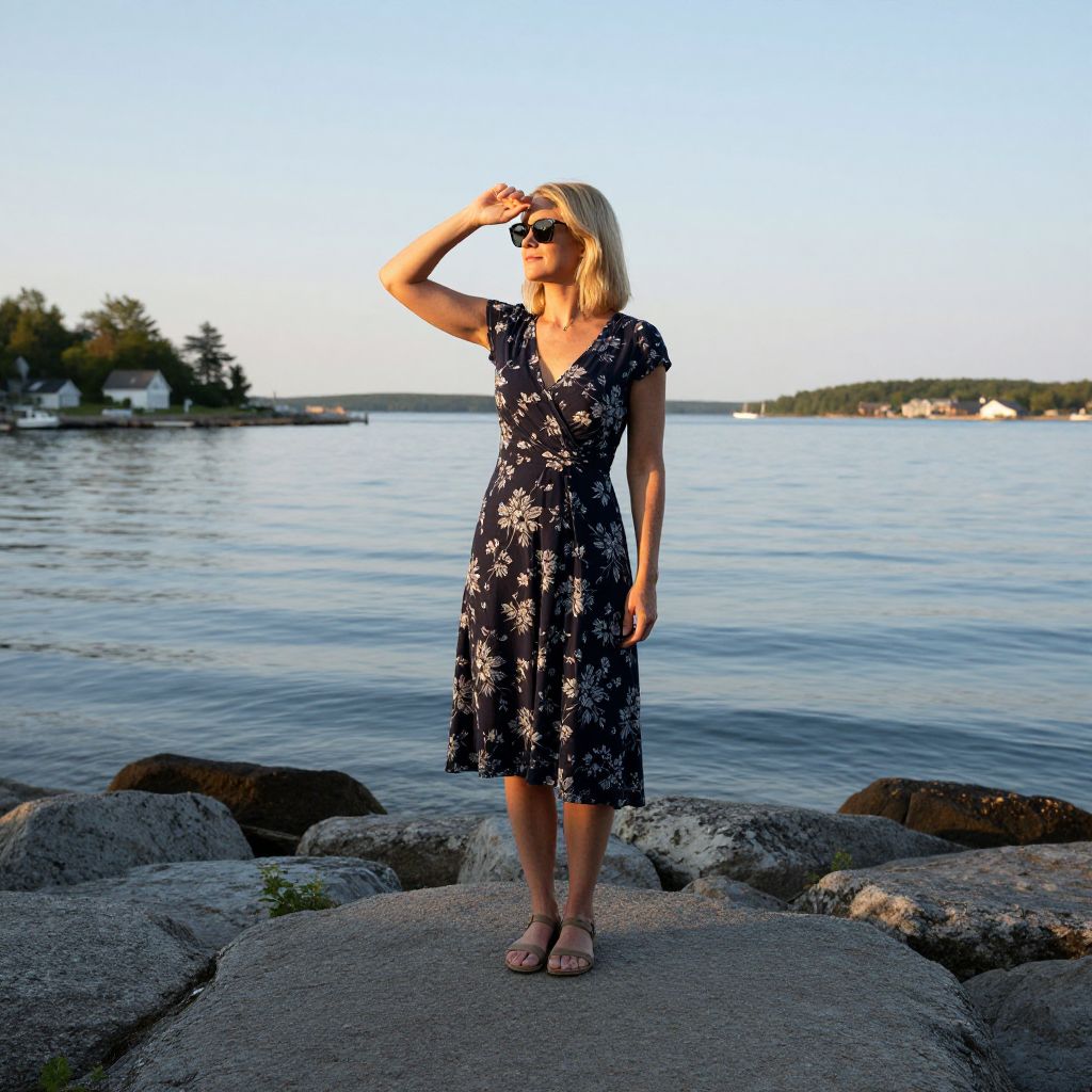 Blonde woman wearing a dark floral dress stands confidently on a rocky shoreline at Boothbay Harbor, Maine, with sunglasses shielding her eyes against the soft daylight as the calm water stretches out behind her.