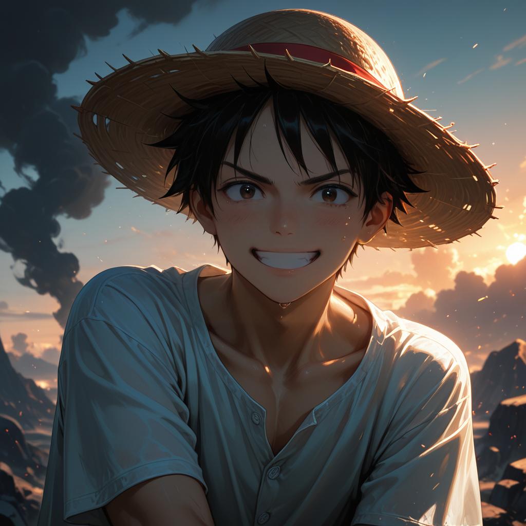 1boy, wanostyle, monkey d luffy, smiling, straw hat, looking at viewer, solo, upper body, ((masterpiece)), (best quality), (extremely detailed), depth of field, sketch, dark intense shadows, sharp focus, soft lighting, hdr, colorful, good composition, smoke all around, spectacular, closed shirt, anime screencap, scar under eye, ready to fight, black eyes, outdoors