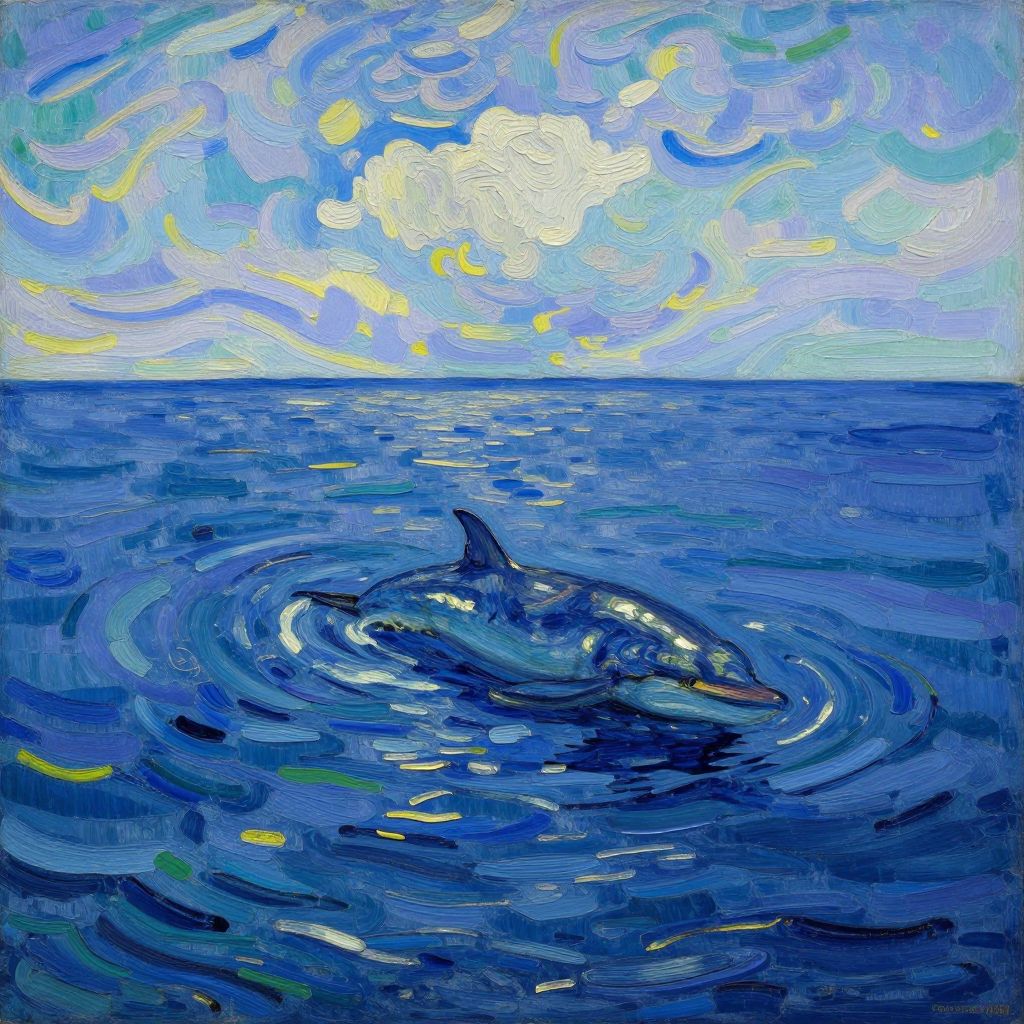 Vibrant oil painting of a dolphin swimming in deep blue ocean, ripples around it, sky with swirling clouds above.