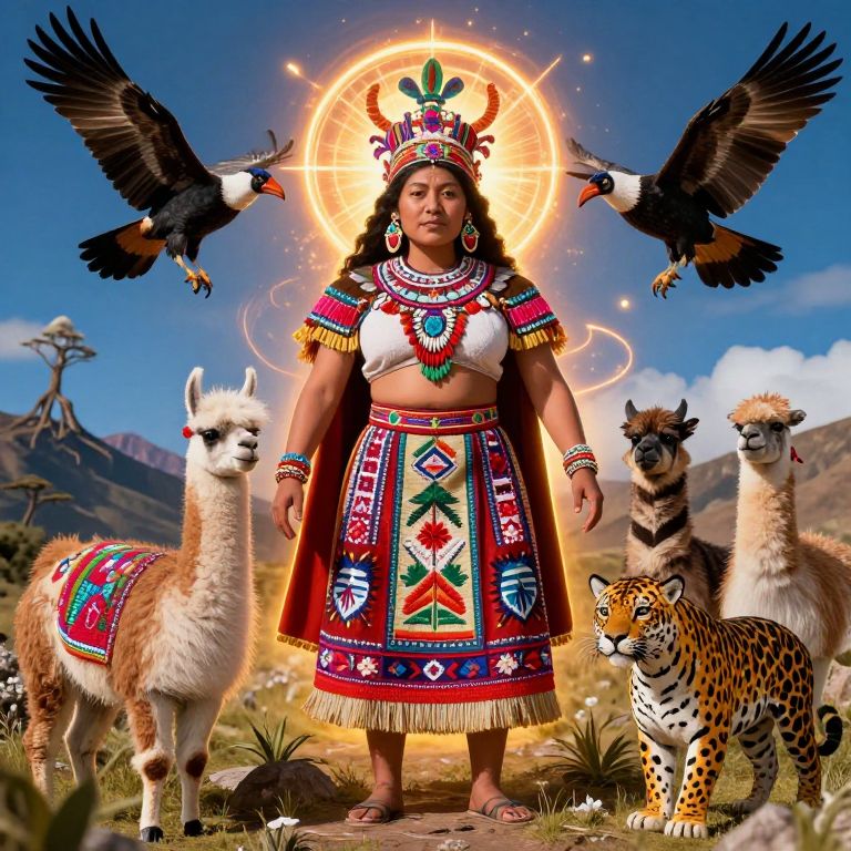 Pachamama portrayed as a powerful spirit of nature, with a glowing aura, surrounded by animals like condors, llamas, and jaguars, traditional Andean textiles and symbols woven into the scene, vibrant colors showcasing the deep connection to earth and life.