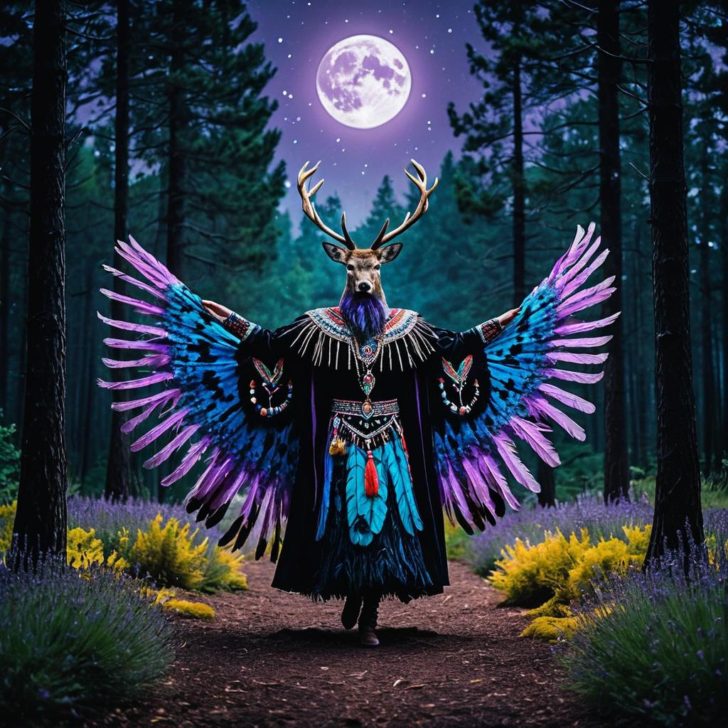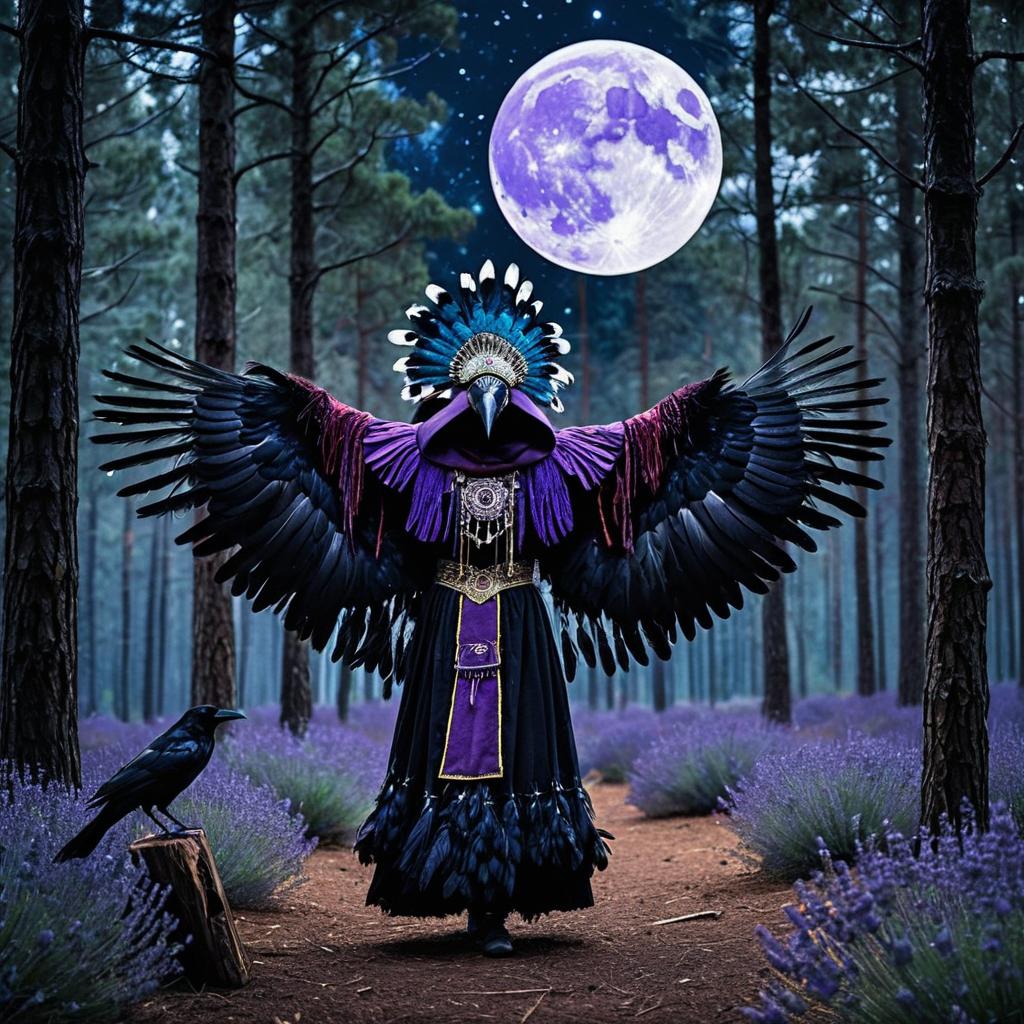 Ceremonial dancer cloaked in plumage, in the forest at night with high trees, lavender moon, and a raven, colorful art