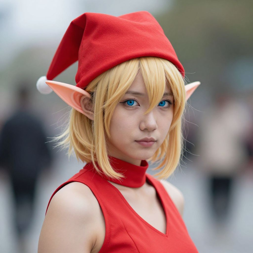 "elf costume red, solo, 1girl, pointy ears, hat, blonde hair, looking at viewer, blue eyes, blurry background, short hair, closed mouth, dress Realistic photo of casual sexy person with pretty face"