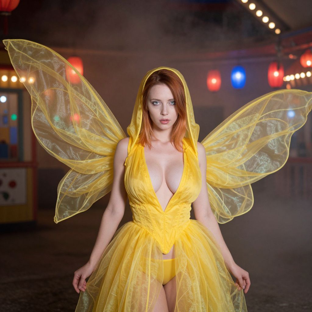 Photograph of a fair-skinned woman with red hair, wearing a revealing yellow fairy costume with translucent wings, standing in a dimly lit, colorful