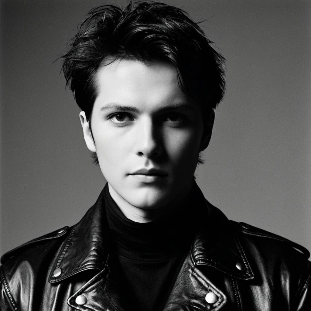 Portrait of a young man with a pale complexion and short tousled dark hair wearing a vintage black leather jacket with a high collar and a black shirt. The man has an intense gaze and a slender silhouette, styled in 1980s fashion, set against a plain studio background. The image is monochrome, emphasizing the classic retro look.