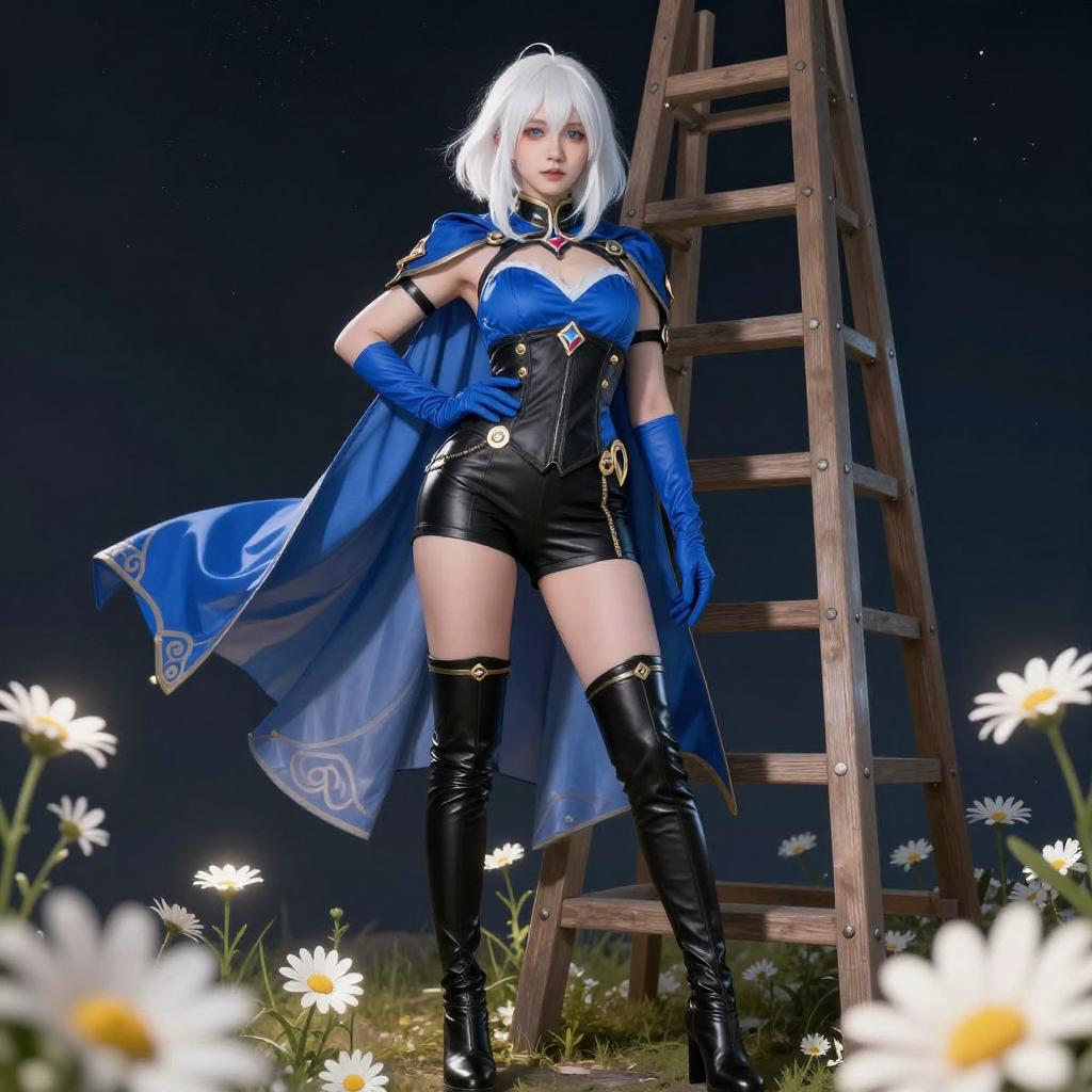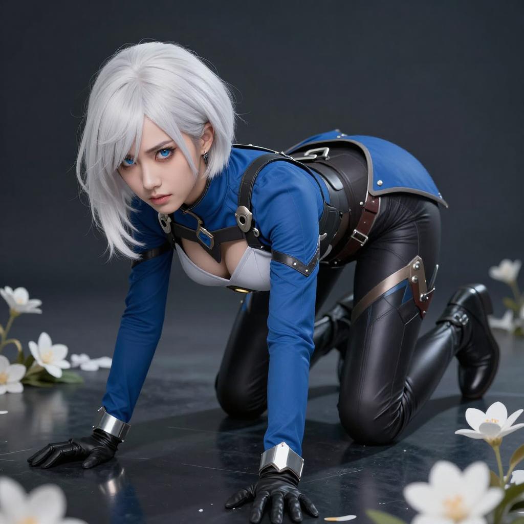 Digital artwork of a nude woman with white hair, blue eyes, and pale skin, kneeling with legs spread. She wears blue gloves, thigh-high boots, and a blue cape, surrounded by glowing white flowers and translucent fabric against a dark background.