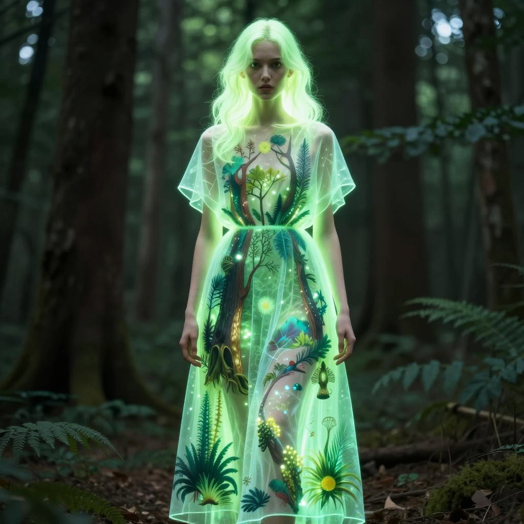 A woman stands in a forest, enveloped in a glowing, neon-green aura that blends seamlessly with the surrounding trees. Her translucent dress features a striking forest design, creating a surreal and futuristic connection between her and nature, rendered in a digital art style with luminous effects.