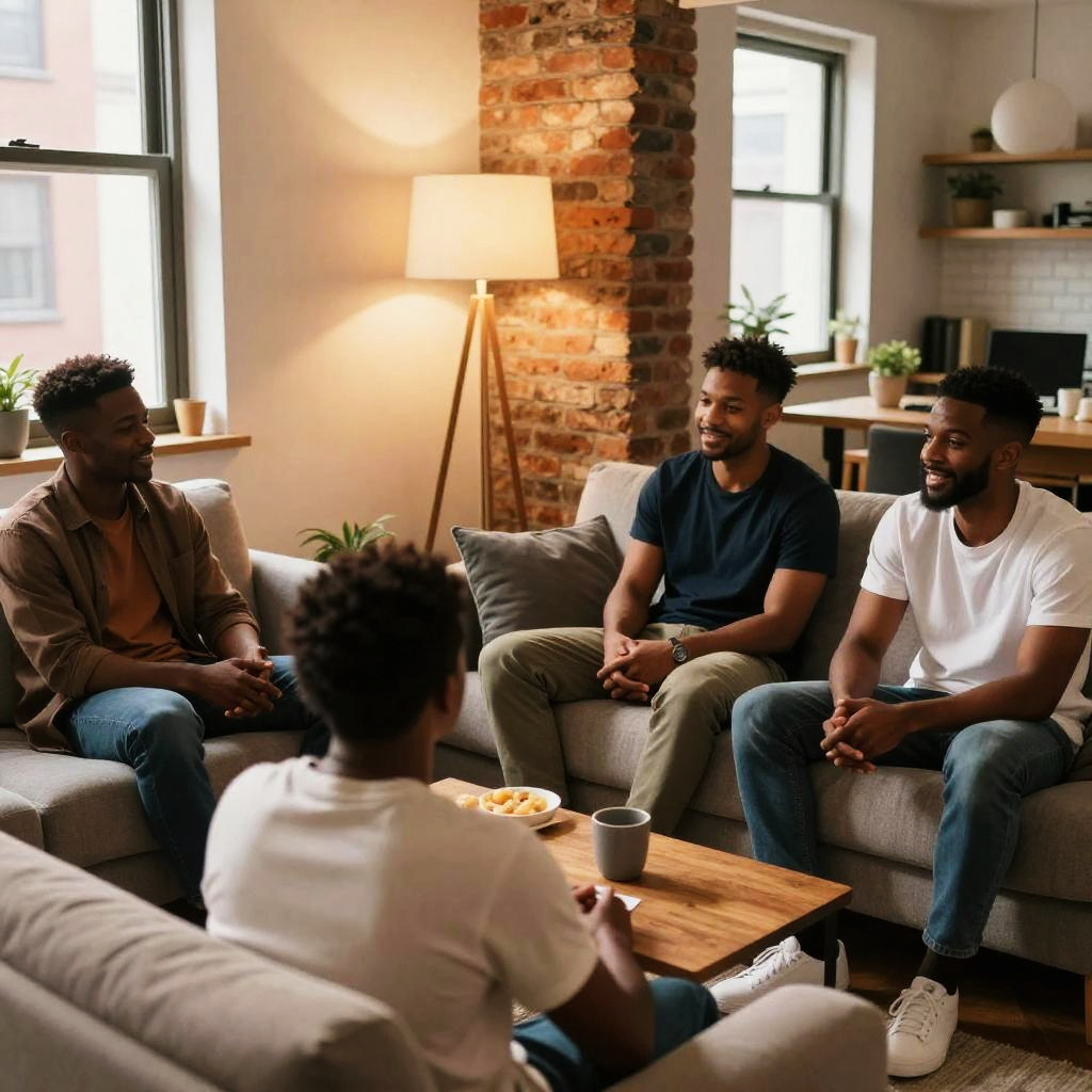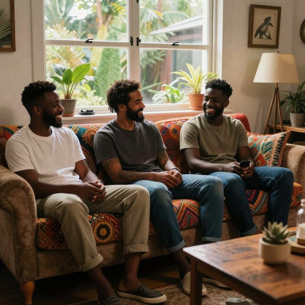 Photograph of three Black men with beards, casually dressed, sitting on a colorful patterned couch in a sunlit living room, smiling and chatting