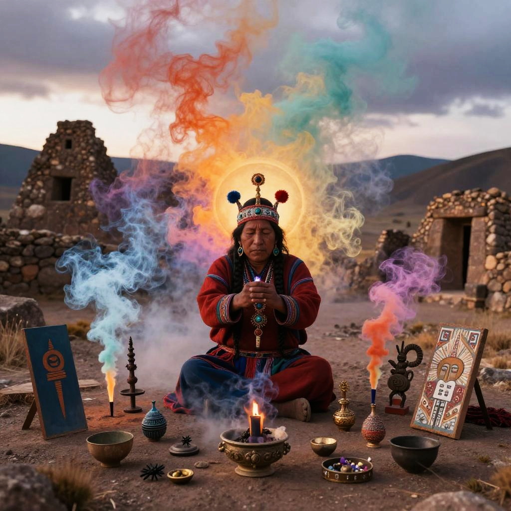 Bolivian folklore ancient ruins with shaman performing ritual, colorful smoke and symbolic artifacts, mystical energy, Andean high plateau at dawn, traditional elements fused with surreal imagery, spiritual aura