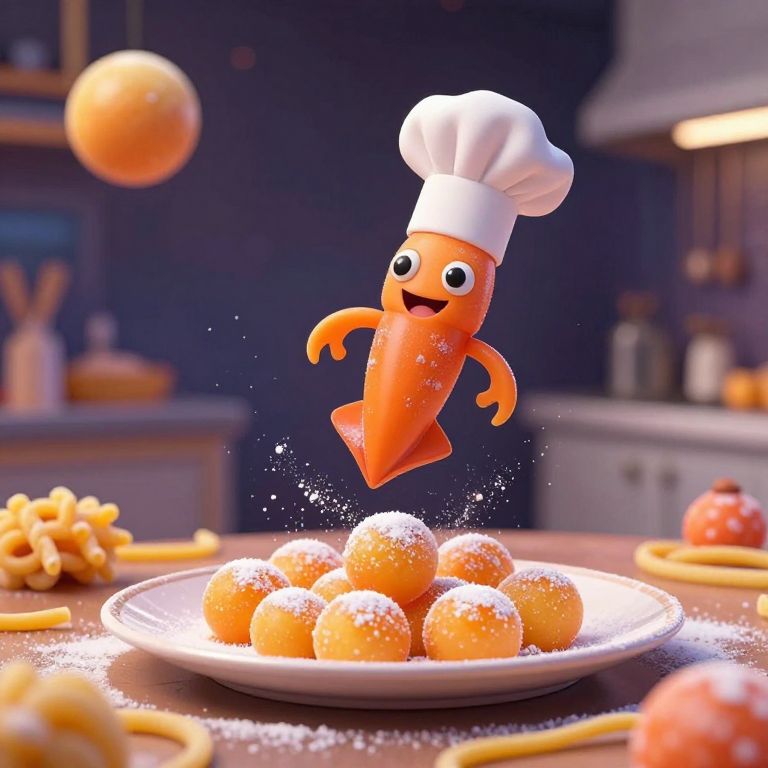 Cheerful orange squid chef donning a white toque gracefully hovers above a plate of golden-orange spheres dusted with powdered sugar, surrounded by floating orbs and pasta strands in a whimsical, cosmic-themed kitchen setting.