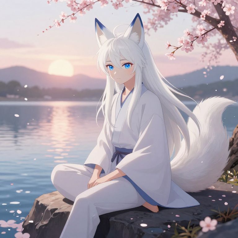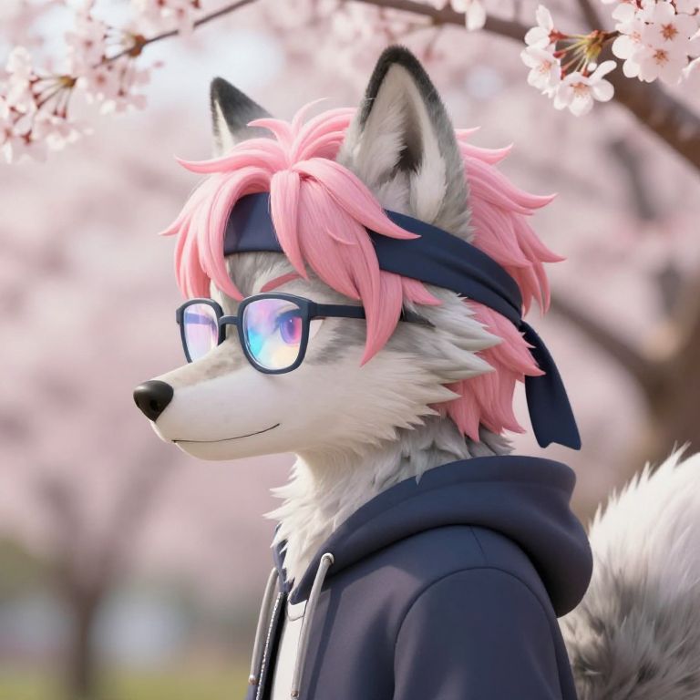 Sandy Profile of an attractive boy with the ears and tail of a wolf, slightly pink hair, a headband, glasses, and a nose patch due to haloing, iu background cherry blossoms. Pictorial, 4k icon,