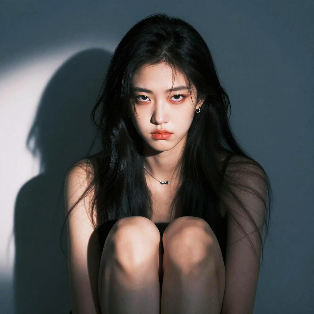 This photograph features a young Asian woman with long, straight black hair, sitting against a dark, shadowed background. She has pale skin, a slender build, and is wearing a black choker necklace. Her expression is serious and slightly melancholic, with red lipstick contrasting her pale skin. She is seated with her knees drawn up to her chest, covering her torso. The lighting creates a stark shadow on the wall behind her, highlighting her face and knees. The overall mood is somber and introspective, with a focus on her intense gaze and the dramatic play of light and shadow.