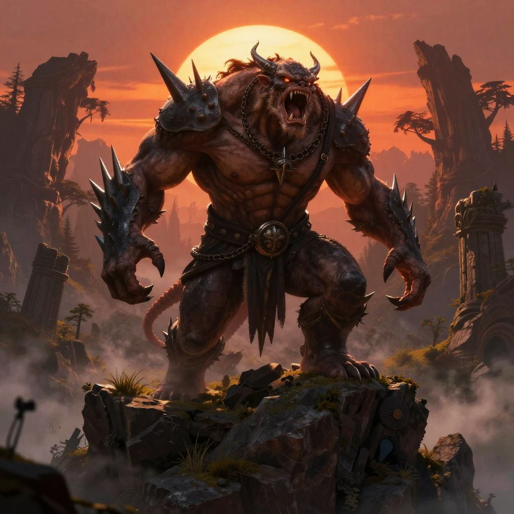 Nergigante, roaring aggressively atop a rocky cliff with pulsating spikes, muscles tense, with a dramatic sunset behind casting deep shadows, surrounded by mystical forests and ancient ruins, highly detailed monster fantasy illustration.