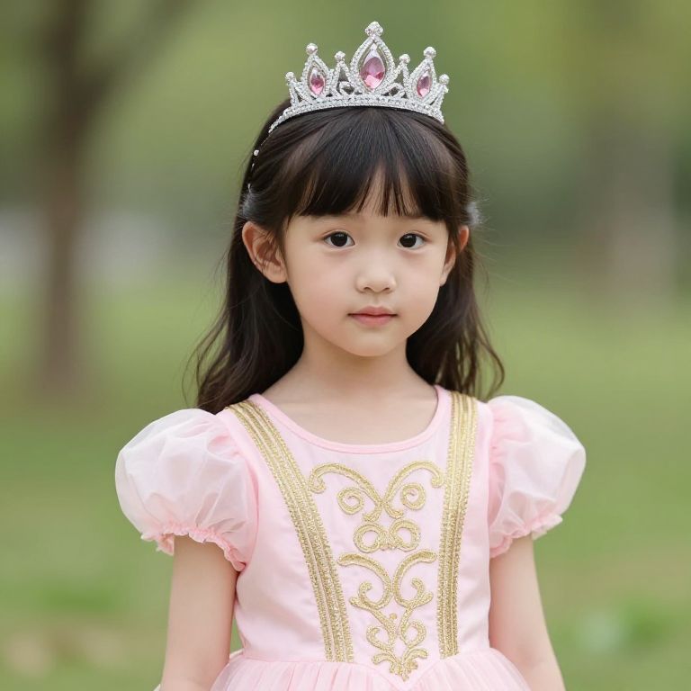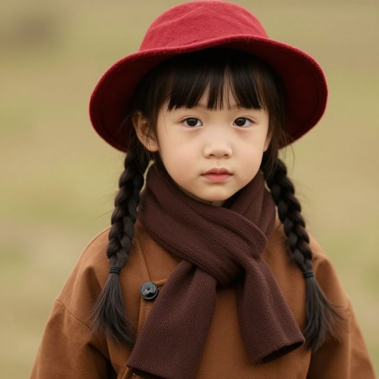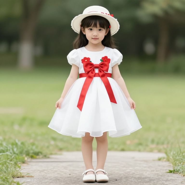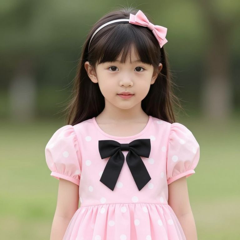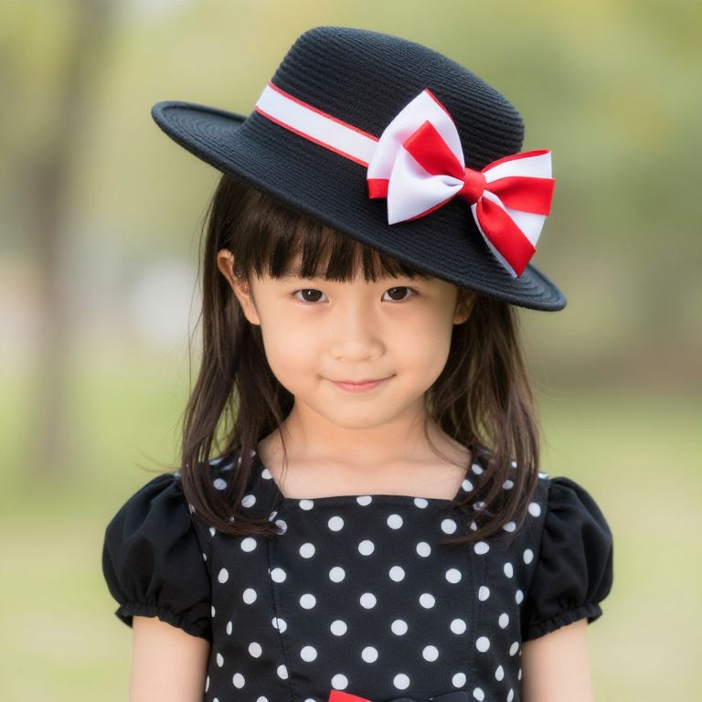 Girl in a polka dot outfit with a black hat and a red and white bow on her head.