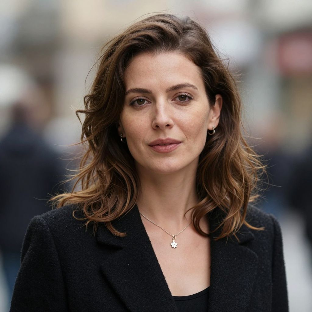 Mid-shot portrait of a beautiful 30-year-old woman from moldova, with freckles and wavy hair, candid street portrait in the style of mario testino award winning, sony a7r