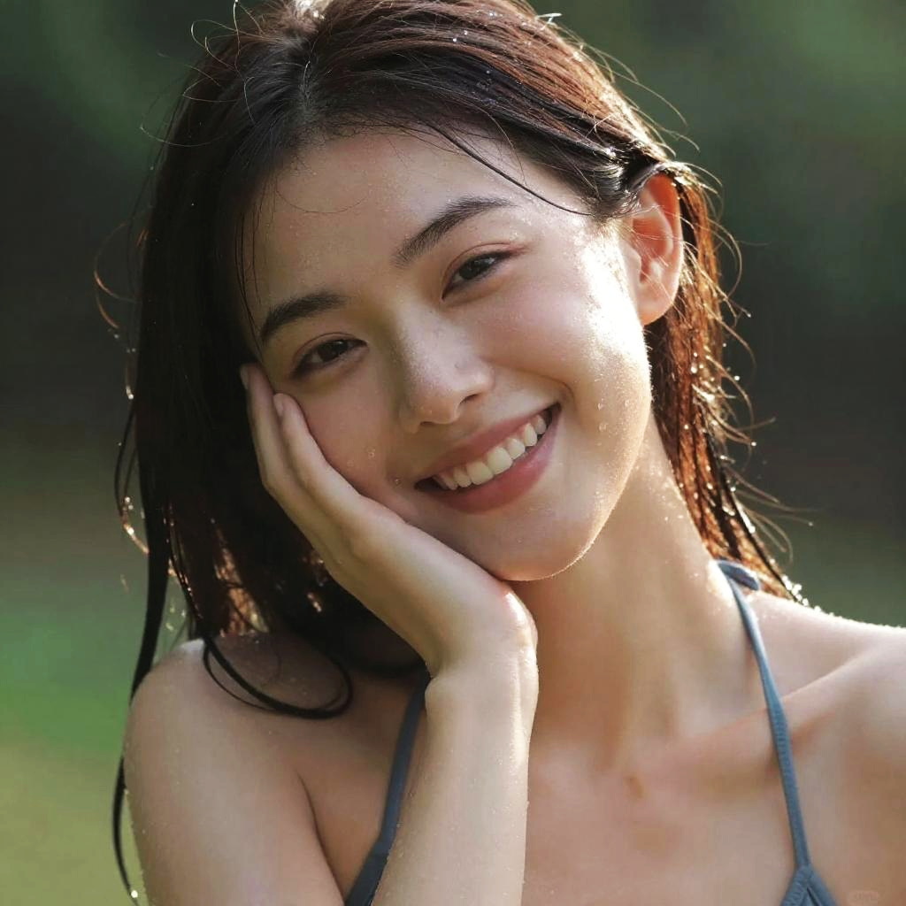Photograph of a smiling young woman with fair skin and dark brown hair, wearing a white tank top. She's holding a clear glass bowl filled with yellow cereal and red strawberries, using a spoon to eat a strawberry. The background is plain and dark, making her and the bowl the focus. She has bright eyes and a playful expression. The image has a casual, candid feel.