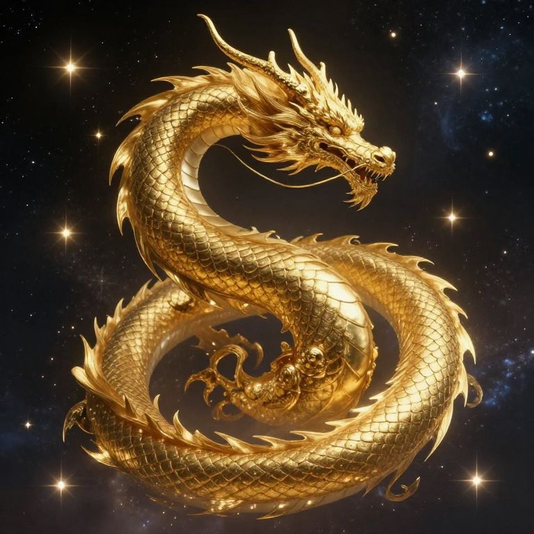An ethereal dragon, cloaked in celestial gold, coils gracefully against the cosmic backdrop, embodying the eternal dance between memory and oblivion, its scales whispering forgotten stories while the stars bear witness to the infinite passage of time.