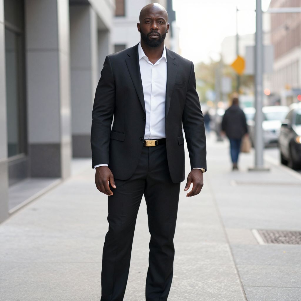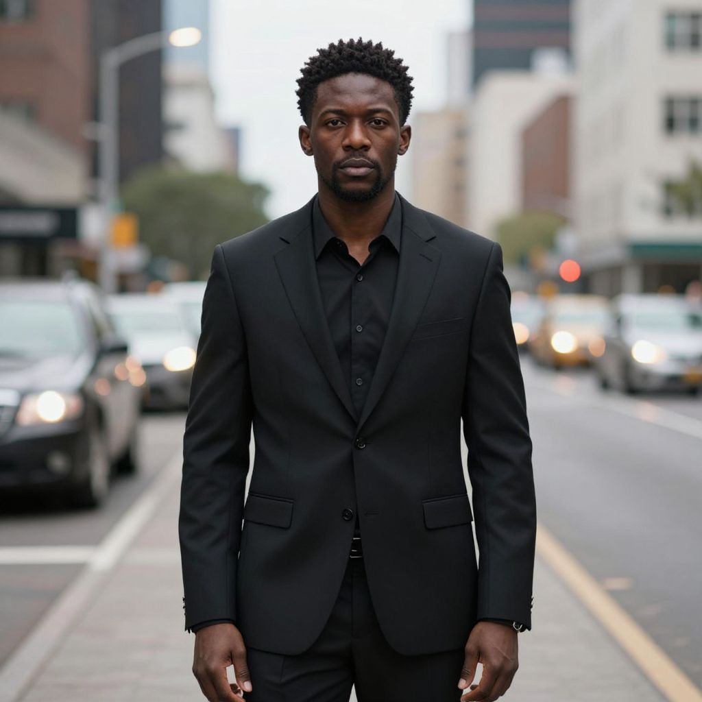 Photograph of a tall, Black man standing against a dark background. He's wearing a dark gray three-piece suit with a white dress shirt and a black tie. He has a trimmed beard and his hands are casually in his pockets. His expression is confident and serious. The lighting highlights his suit, making it the focal point. He's wearing black dress shoes.