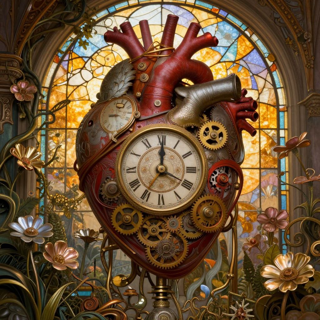 This digital artwork features a steampunk-style, intricately detailed clock heart with red and silver metallic components, gears, and a large central clock face with Roman numerals. The heart is surrounded by vibrant flowers with pink and white petals, and green vines. The background reveals a large, arched stained glass window with colorful, glowing light patterns, including shades of yellow, orange, and blue. The clock heart stands on a golden pedestal, blending industrial and organic elements in a rich, textured composition. The overall style is surreal and whimsical, with a strong focus on contrast between mechanical and natural elements.