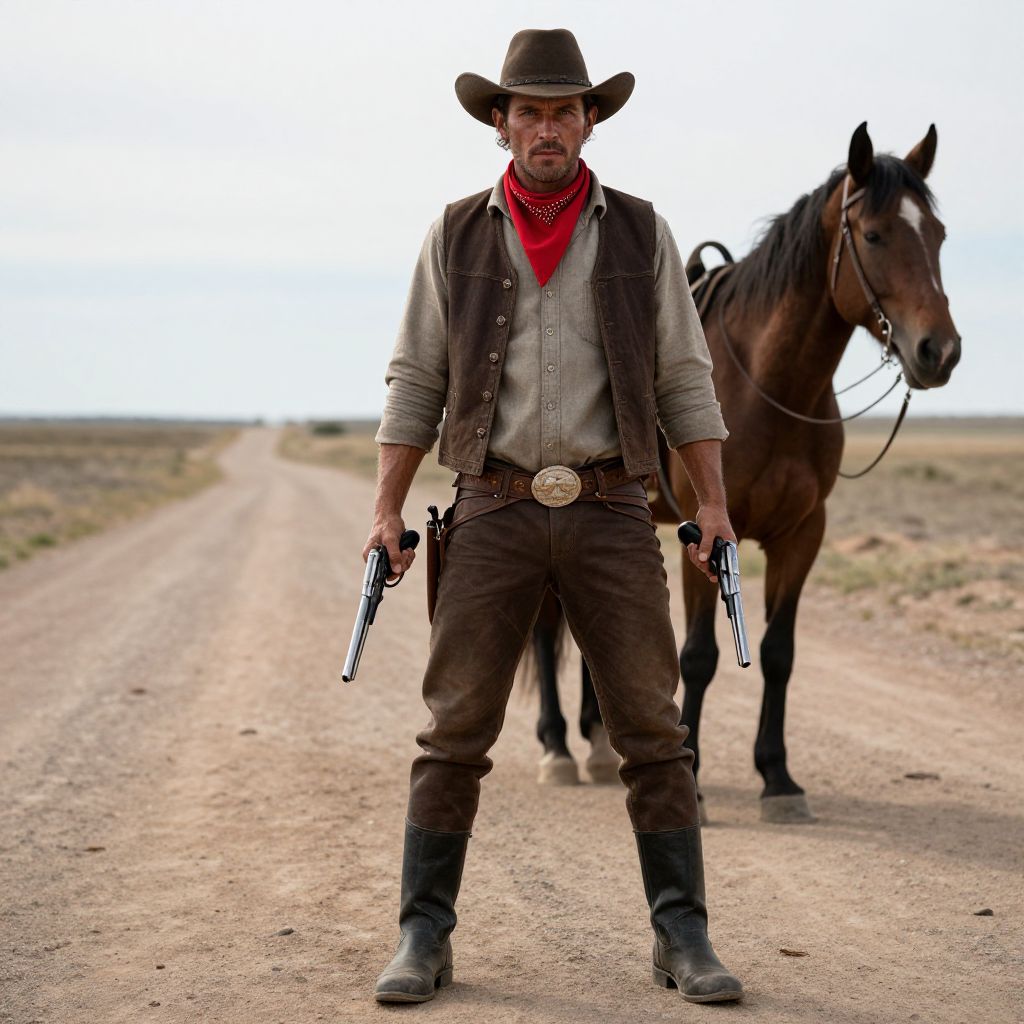 A man in a cowboy outfit is standing on a dirt road. He is wearing a brown hat, a red scarf, and black boots. The man is holding two guns in his hands, and there is a horse in the background. The man has a rugged appearance, with a strong, muscular build and a confident, determined expression. His face is weathered by the elements, and his eyes are sharp and alert, reflecting the intensity of the moment. The scene is set in a desolate, open landscape with a hint of danger and mystery.