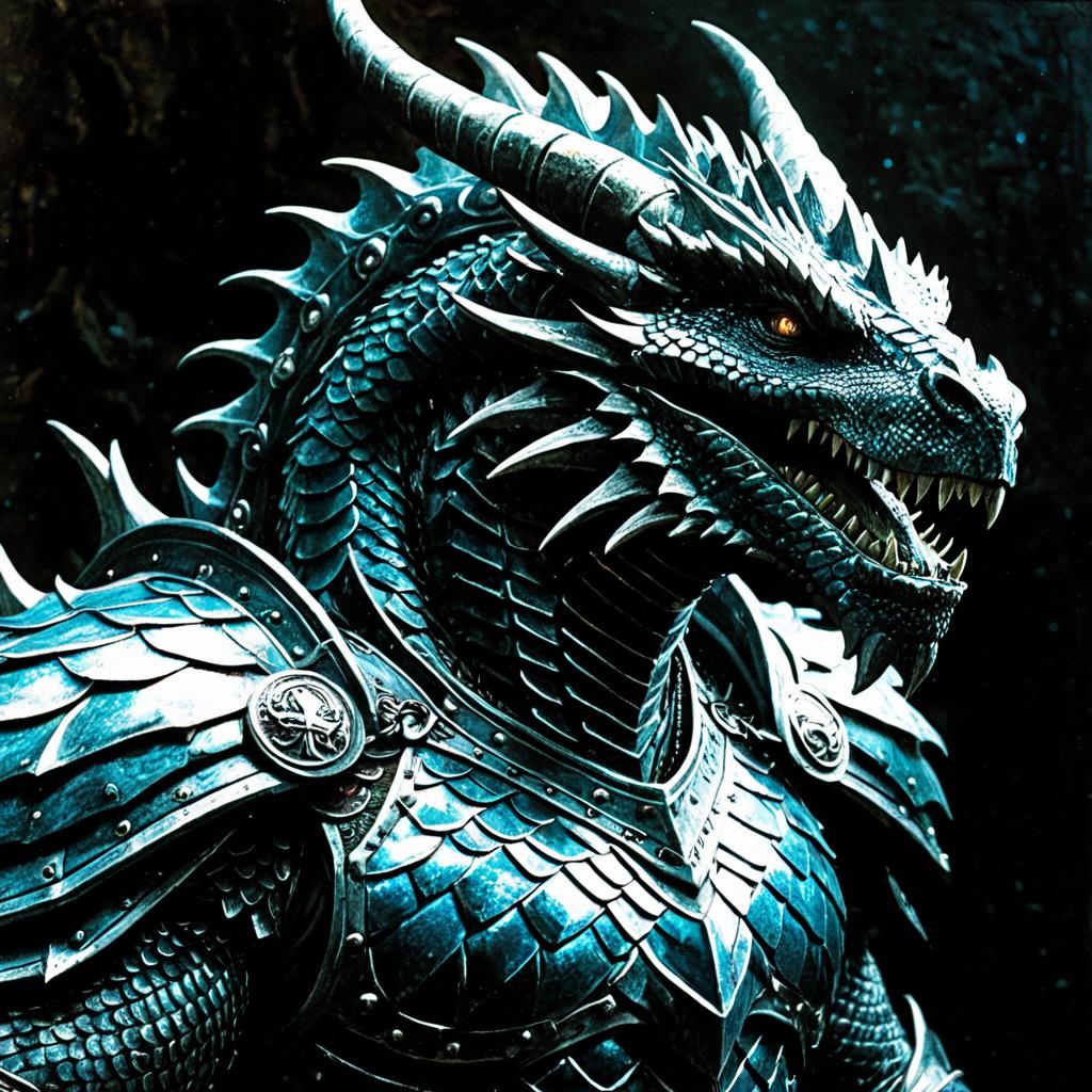 Detailed close-up of a cybernetic dragon head with intricate metallic scales and sharp spikes. The dragon features a glowing orange eye and a dark, mechanical texture, set against a black background. Digital art inspired by fantasy and sci-fi themes.
