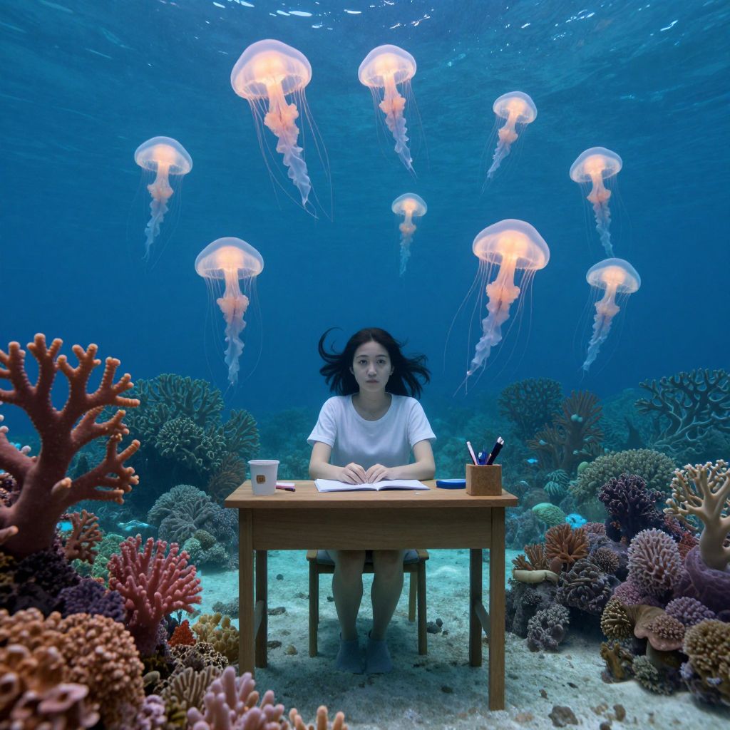 Photograph of an underwater scene featuring a young Asian woman with long black hair, wearing a white t-shirt, sitting at a wooden table. She is centered in the image, holding an open book, with a coffee cup and a pen holder on the table. Surrounding her are vibrant coral reefs and eight glowing jellyfish with translucent, orange-tipped bellies floating above. The background is a deep blue ocean, with sunlight filtering through the water. The coral reefs are colorful, with red, pink, and purple hues, adding a lively contrast to the blue water. The overall composition is surreal and dreamlike.