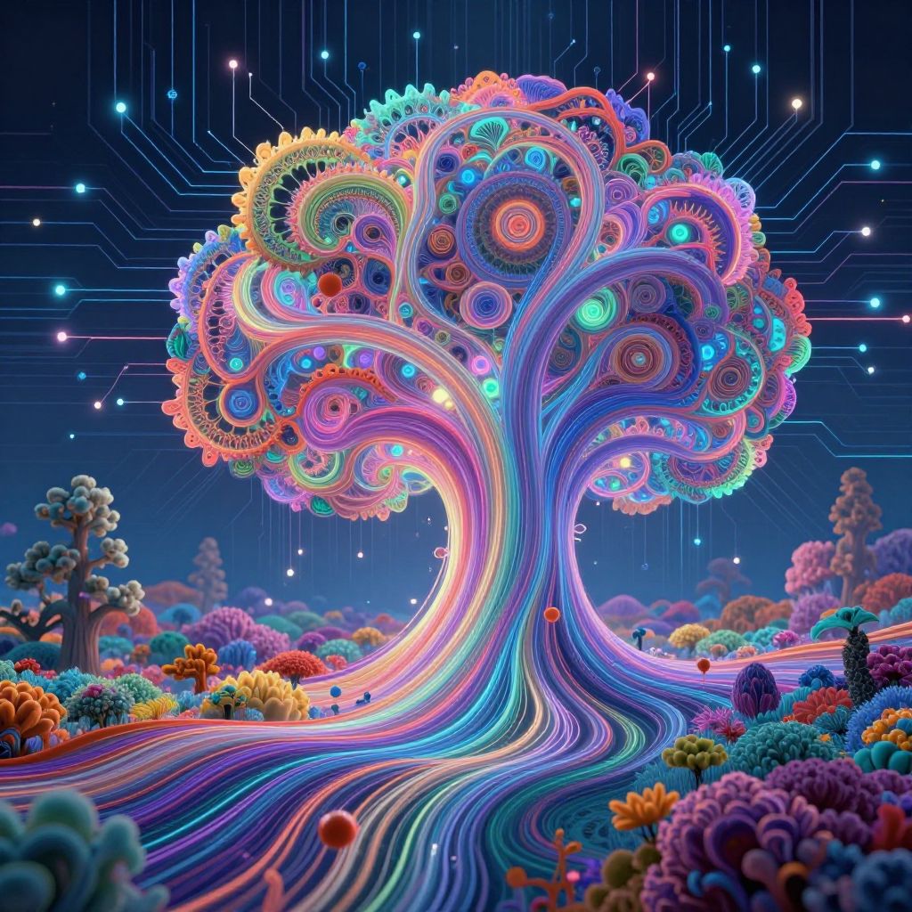 AI generating art as a complex neural network visualization with flowing data streams transforming into colorful surreal landscapes and intricate fractal patterns, glowing circuits in the background, blending technology and creativity in a digital dreamscape.